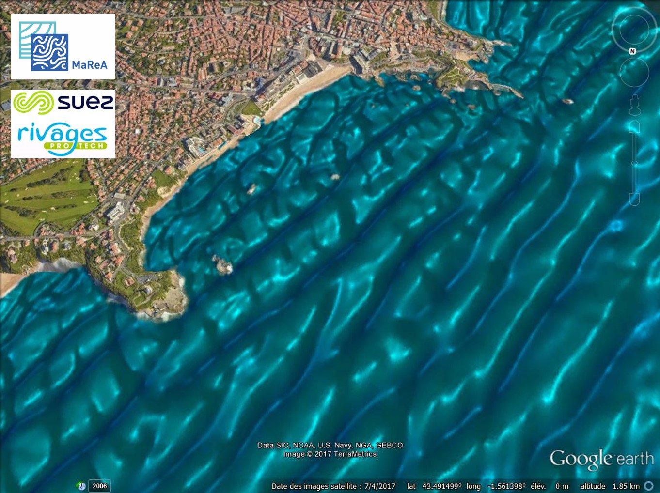 Así, en el momento en que se anuncie un temporal, las herramientas informáticas desarrolladas en el marco de MAREA deberán poder predecir, con antelación, dónde y cuándo el agua pasará por encima de las infraestructuras de protección de las 7 zonas piloto del proyecto. Podrán, igualmente, anticipar los movimientos sedimentarios y el retroceso de la línea de costa provocados por los temporales. La siguiente imagen es un ejemplo del modelo hidrodinámico de predicción de las condiciones de oleaje en la Grande Plage de Biarritz.